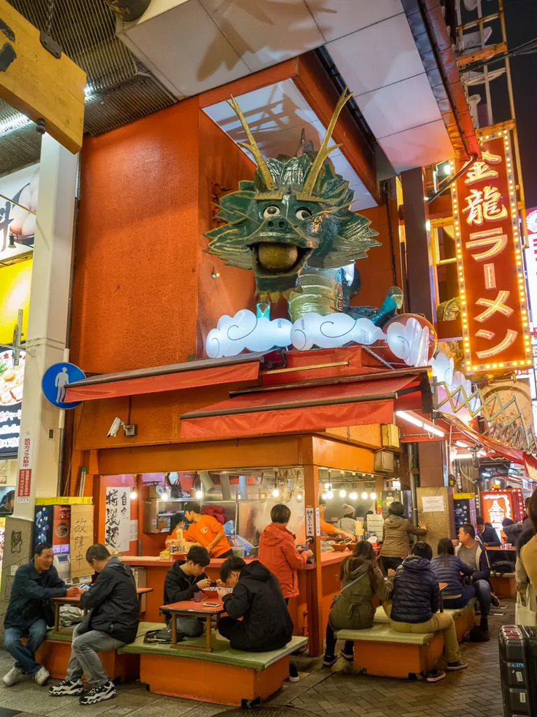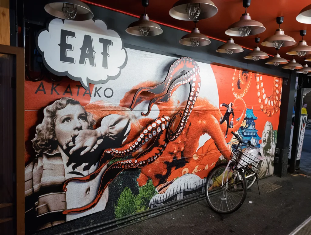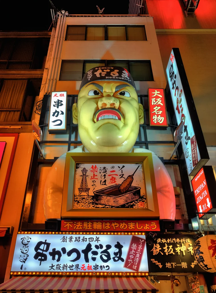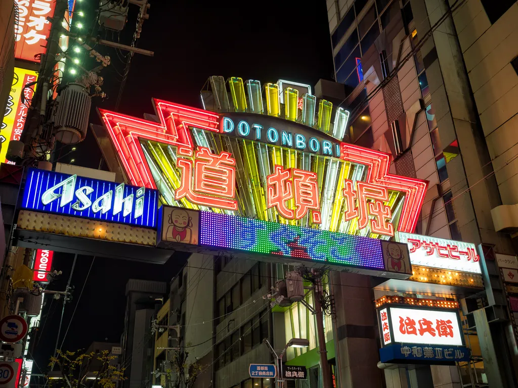 The Glico Running Man 1935 brightly lit up over Dotombori canal Osaka Night timeAsahi Super Dry sign lit up over Dotombori canal Osaka Night timeEat Akatako Osaka Night timeThe moving crab sign of the Kanidouraku Dotombori Honten crab restaurant in Dotombori Osaka Night timeThe fun signage of the Gyoza or dumpling store in Dotombori Osaka Night timeThe Konamon Museum in Dotombori where you can learn about Takoyaki Osaka Night timeGiant fingers hold sushi over a couple walking through the streets of Dotombori Osaka Night timeThe angry chef sign above the Kushikatsu Daruma restaurant in Dotombori Osaka Night timeThe fun 3 D signage of the Yaki niku restaurant in Dotombori Osaka Night timeJapanese woman serves up delicious melonpan ice cream from a van in Dotombori Osaka Night timeMelonpan bread sandwich with ice cream and mango sauce in Dotombori Osaka Night timeThe second delicious melonpan ice cream van in the world in Dotombori Osaka Night timeSpiderman climbing into a clam above a Kobe Beef restaurant in Dotombori Osaka Night timeThe Dotonbori Ferris Wheel opens in Jan 2018 after nine years its been out of commision Dotombori Osaka Night timeIchiran Ramen booth where your waiter appears from under the bamboo blind if you need anything Dotombori Osaka Night timeTsutenkaku Tower Osaka Night time
