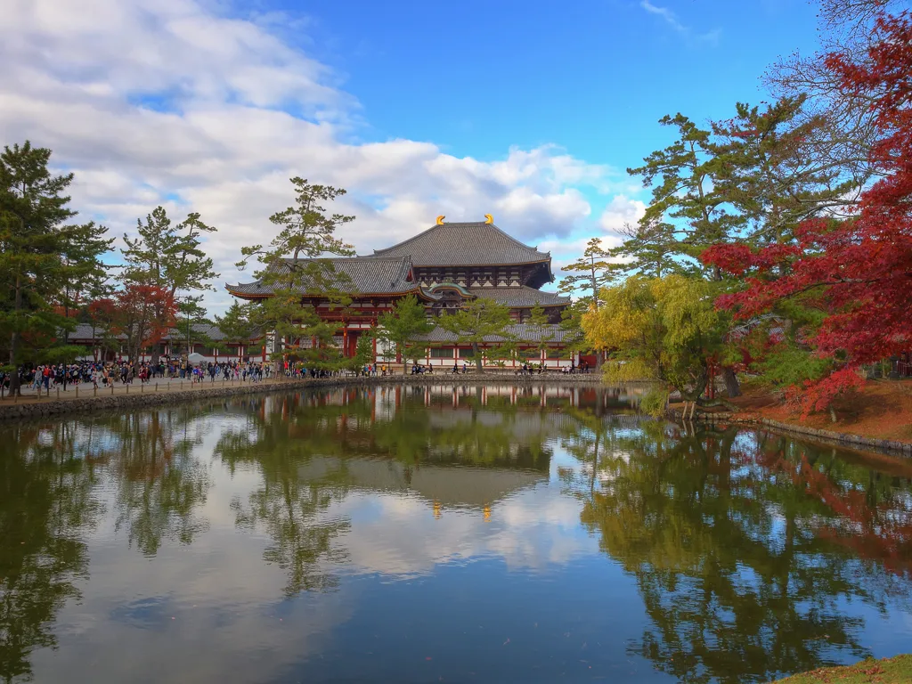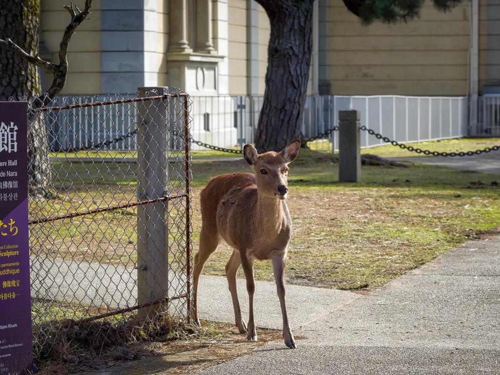 Catching the train to Nara KyotoNara Station building opened in 1890 NaraConcrete lantern belongning to the Nara Station building NaraWooden deer scuplture outside a shop in Nara NaraMelonpan shop NaraDecorative stained glass telephone box NaraNara deer manhole cover NaraFreshy squished Mochi ready to go on sale NaraMochi or Japanese rice cakes being processed NaraThe famous Mochi or Japanese rice cake with red bean paste filling NaraSarusawa ike Pond NaraEntrance to Nanendo Hall at Kofukuji NaraThe octagonal Nanendo Hall at Kofukuji NaraKofukuji Five Storied Pagoda NaraDeer popping its head through the gates at the exit of Kofukuji NaraDeer biscuits waiting to be eaten NaraThe Deer rule book NaraJapanese senior feeding the deer at Nara Park NaraUnusual deer mascot NaraStall selling deer biscuits at the Great South Gate Todai ji NaraDeer roaming freely at The Great South Gate in Tōdai ji NaraGirls feeding deer at The Great South Gate in Tōdai ji NaraThe largest temple entrance gate in Japan The Great South Gate or Nandaimon Gate in Tōdai ji NaraOne of the two Kongo Rikishi at The Great South Gate in Tōdai ji 8.4 meters in height NaraClose up of one of the two Kongo Rikishi at The Great South Gate in Tōdai ji NaraLooking through the protective mesh of one of the two Kongo Rikishi at The Great South Gate in Tōdai ji NaraKagamiike with autumn colors in Tōdai ji NaraTodaijis main hall the Daibutsuden the worlds largest wooden building NaraThe bright autumn colors of the Japanese red maple in Todaiji NaraTwo deer wander through the yellow leaved covered autumn grounds of Todaiji NaraDeer bowing in front of Todaiji HokkeDo in Todaiji NaraHilltop buddhist hall in Todaiji NaraThe magnificent panorama of Nara at Hilltop buddhist hall in Todaiji NaraClose up of a lantern in autumn colors of the Hilltop buddhist hall in Todaiji NaraTemple roof detail in the autumn colors of the Hilltop buddhist hall in Todaiji NaraShrine in the hills behind the Hilltop buddhist hall in Todaiji NaraGift made by the tourist office receptionists mother Nara